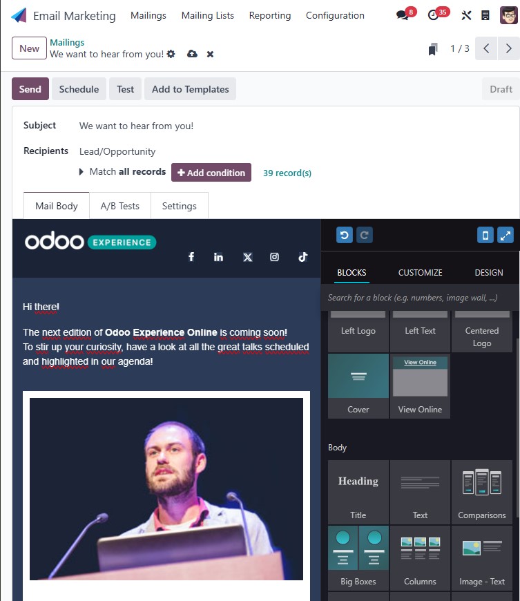 Le module Marketing d’Odoo vous aide à engager vos clients grâce à des outils puissants et intuitifs.